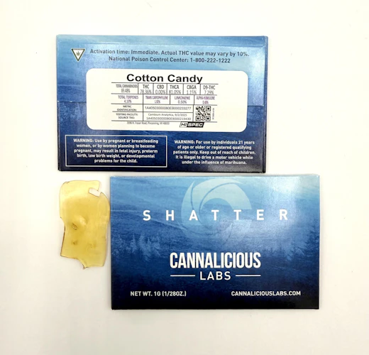 Terpenes give cannabis its distinct smell and flavor. They also work with cannabinoids to create the plant's various effects and benefits. The most abundant terpene in Cannalicious - 1g Shatter - Cotton Candy is Limonene, followed by Humulene and Linalool.