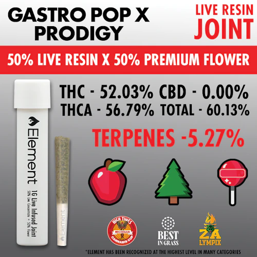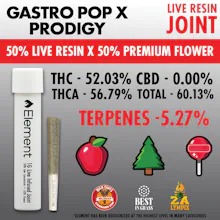 50% Element Live Resin, 50% top-shelf flower, the Element Live Resin Joint is certified 100% fire. This award-winning infused pre-roll adds the power of Element Live Resin to premium flower, resulting in a naturally terpene rich joint with THC percentages commonly 45% or above.