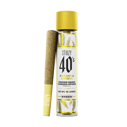 Elevate your pre-roll game. Stiiizy 40s pre-rolls are setting the standard with high potency, cannabis infused joints coated evenly with kief. Using our proprietary live resin infusion methods, we’ve designed every pre-roll to offer 40%+ THC potency with a unique flavor profile. With a smooth inhale and tasteful exhale, each and every Stiiizy 40 is packed with indoor grown flower, specifically made to ensure a potent and long-lasting high. Spark up the 40s. PINEAPPLE EXPRESS TASTE: Fruity, Tropical, Pine FEELING: Energizing, Euphoric, Focus DESCRIPTION: A Sativa-dominant hybrid born of parent strains Trainwreck and Hawaiian, the energetic high is perfect for taking a scenic walk.