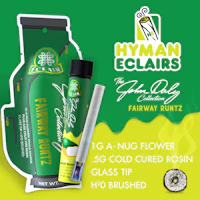 John Daly Fairway Runtz | 1.5G Éclair Handcraft | HYMAN | REC The new fan favorite, elevated. Each Éclair is handcrafted with 1g of premium flower and infused with 0.5g of cold-cured, single-source rosin. Finished with our signature glass tip and H2O brushed for a perfect seal and an even burn — all for the perfect HY. GET BAKED TWICE 💨 Strain Type: Indica Mood: Peaceful & Relaxed Flavor & Aroma: Candy, Melon Experience: Euphoric, Happy, Relaxed, Uplifted