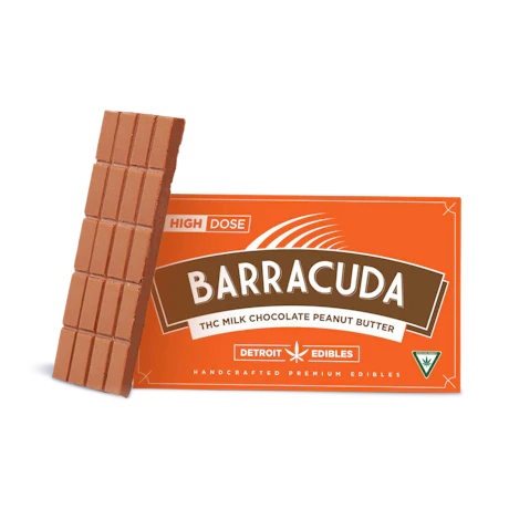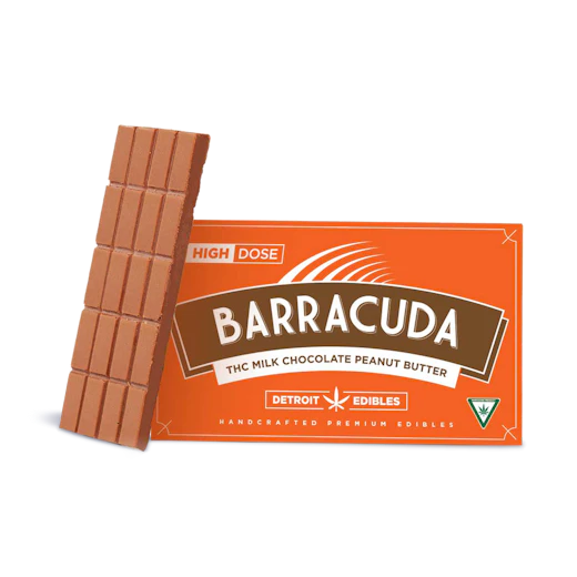 Barracuda Bars are crafted from the highest-quality ingredients. The chocolate is made of 65% Belgian chocolate combined with the purest distillate from our very own Michigan-made Cannalicious Labs for the smoothest consumption experience to date. Fully activates in 1-2 hours. Ingredients: Milk Chocolate (Sugar, Milk, Cocoa Butter, Chocolate Liquor, Soy Lecithin, Vanillin), Cocoa Wafer (Sugar, Vegetable Oil, Nonfat Dry Milk, Cocoa Milk, Glyceryl Lacto Esters of Fatty Acids, Soy Lecithin, and Salt), Peanut Butter Powder (Roasted Peanuts, Sugar Salt), Cocoa Butter, Cannabis Extract. Contains milk, peanuts and soy.