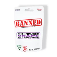 Enjoy in the exquisite essence of our Full Spectrum THC-infused Grape Gummy Clusters, tantalizing the senses with a grape flavor that's sweet, succulent, and juicy. Each plump, ripe grape bursts with a flavorful symphony, enveloping your palate in a delicate yet bold dance of vibrant purple hues. The crisp and refreshing notes leave you yearning for another delicious bite. With a chewy yet non-sticky texture and the signature infusion of Nerds at the center, these delectable Grape Gummy Clusters offer an attention-to-detail experience that invites you to explore the world of cannabis through the lens of rich grape delight. Visit your favorite dispensary and experience the BANNED effect today! Effects: Precisely dosed at 50mg of THC in each gummy, the perfect dose to relax and send a user into a relaxing haze of bliss. These gummies are great for winding down and chilling out.