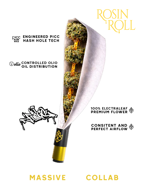 The Rosin Roll represents the evolution of the infused pre-roll a collaboration built on quality, consistency, and advanced technology. Crafted with premium Electraleaf flower, engineered using PICC Hash Hole technology, and enhanced with carefully distributed Olio rosin, this roll is designed to deliver a balanced, flavorful, and smooth experience from the first pull to the final burn. Every element is intentional: the structure, the airflow, the infusion method, and the overall smoking performance.