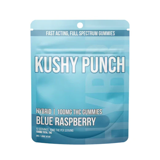 10 Individual Kushy Punch Gummies -100mg THC -Hyrbid -Blue Raspberry Flavor -Contains Full Spectrum Oil -15 Minute Fast Activation