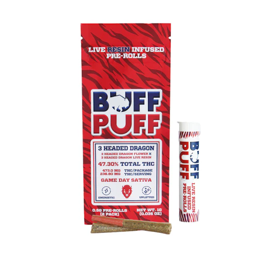 Gametime Sativa BUFF PUFF’s “3 Headed Dragon” Live Resin Infused Pre-rolls, our Gametime Sativa, unite locally grown 3 Headed Dragon flower with its matching 3 Headed Dragon Live Resin, extracted exclusively from fresh-frozen cannabis. This sativa combines citrusy, fruity, and melon-like flavors for a refreshing and invigorating taste. Built for the big moments, this pre-roll delivers an energetic and uplifted experience.