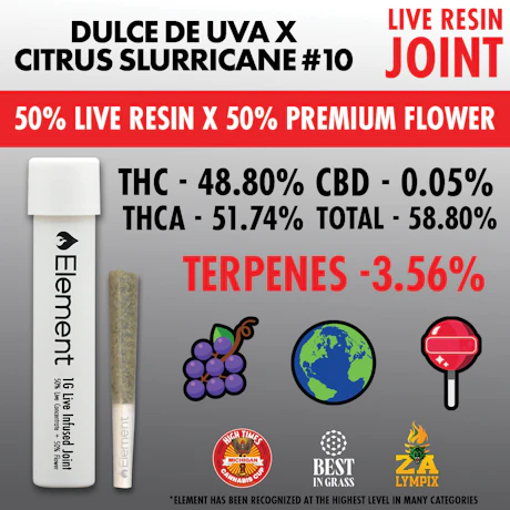 50% Element Live Resin, 50% top-shelf flower, the Element Live Resin Joint is certified 100% fire. This award-winning infused pre-roll adds the power of Element Live Resin to premium flower, resulting in a naturally terpene rich joint with THC percentages commonly 45% or above.