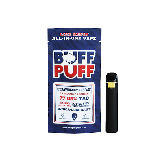 Strawberry Parfait Indica-Dominant Parents: Sisters Cheese X Blueberry Muffin Flavor/Smell: Sweet berry pie, toaster strudel flavors Effects: Creative, Motivated BUFF PUFF’s Live Resin All-in-One Vapes use Live Resin extracted from our fresh-frozen cannabis, ensuring a pure experience free from synthetic terpenes and distillates. The inhale-activated device features a ceramic heating element for even draws and USB-C rechargeability for added convenience.